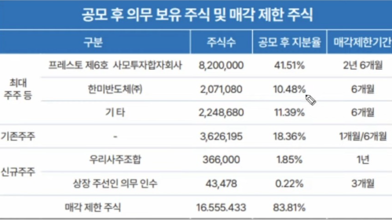 HPSP는 2022년 7월15일 상장 하였고, 사모펀드가 지분율 41.51%로 매각 제한기간이 2년 6개월로 2025년 초에 물량이 나올수 있습니다. 보호예수는 상장하고 매각을 제한 하는 것으로 매각 제한 기간이 풀리면 대량 매도로 주가가 떨어 질수 있으므로 주의 할 필요가 있습니다.