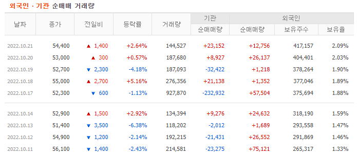 아래와 같이, 반도체 업황도 안 좋고, 경기 침체에 대한 우려로 주가가 하락 하는 시점에서 지속적으로 외국인이 매수 하고 있습니다. 중/ 장기적으로 분할 매수 괜찮다는 의견입니다.