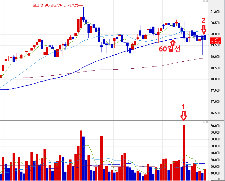위 차트는 국내 인도 투자 ETF 차트 입니다. 1번 보시면, 거래량으로 엄청 빠졌습니다. 2번에서 짙은 선(이동평균선) 60일선을 깨고 아래로 내려 왔습니다. 거래량에 큰 변화라 추세적 하락이 있을 수 있습니다. 관망하면서, 20일 평균 이동으로 올라 올때 매수 하는 것이 좋겠습니다. 세계 경기가 안좋아,주식 비중을 줄려도, 인도와 같은 주식으로 옮겨올 가능성이 높습니다.