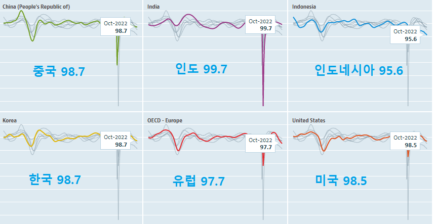 또 아래 사진은 OECD 자료로 경기선행 지수 입니다. 100을 기준으로 모두 100이하 입니다. 100이하는 경기가 하락 한다는 것입니다. 그중에 인도는 99.7로 가장 낮은 수치 입니다.