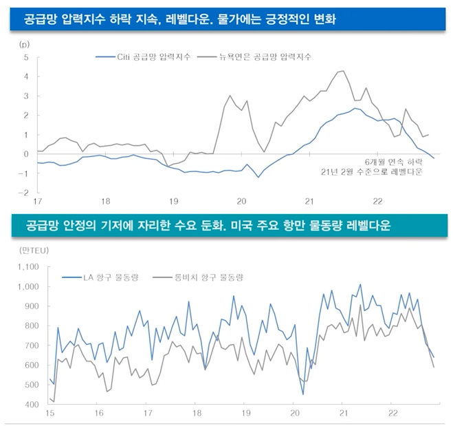 > 공급망이 안정화되고(공급망 압력지수 하락), 미국 주요 항만 물동량 하락