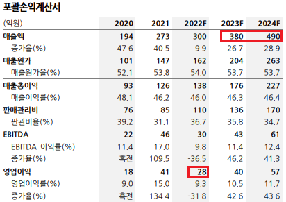 2023, 2024 매출 전망이 좋으며, 2022년 스펙상장으로 비용발생으로 인한 영업이익이 감소