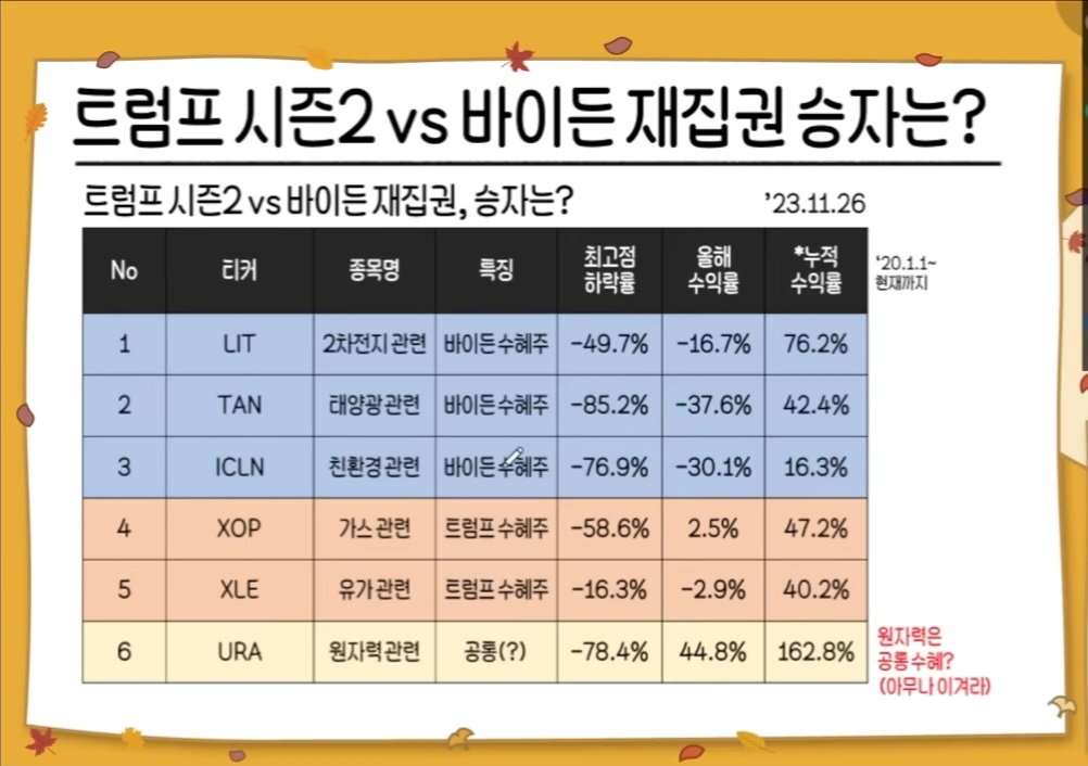 지금, 지지율로는 트럼프가 우세하지만, 양쪽 모두 영향을 받지 않는 섹터가 옅은 노란색 원전주 입니다.
