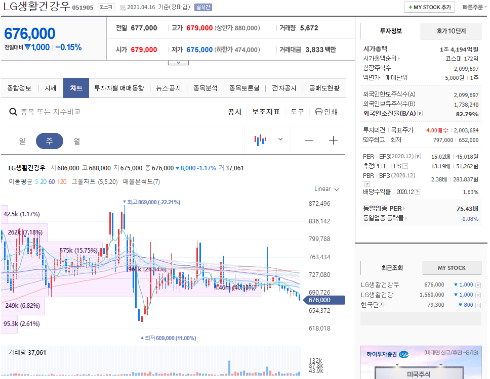 아래는 LG생활건강우로 LG생활건강 주가에 비해 떨어져 있습니다. 상승에 대한 기대를 가질 수 있습니다. 우선주는 보통주를 따라 가기 때문에 더더욱 그럴 수 있습니다. 관심을 가지고, 지켜 볼만한 주식 입니다. 애널리스트 목표주가 무려 200만원 입니다.