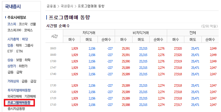네이버>네이버증권>국내증시>프로그램동향