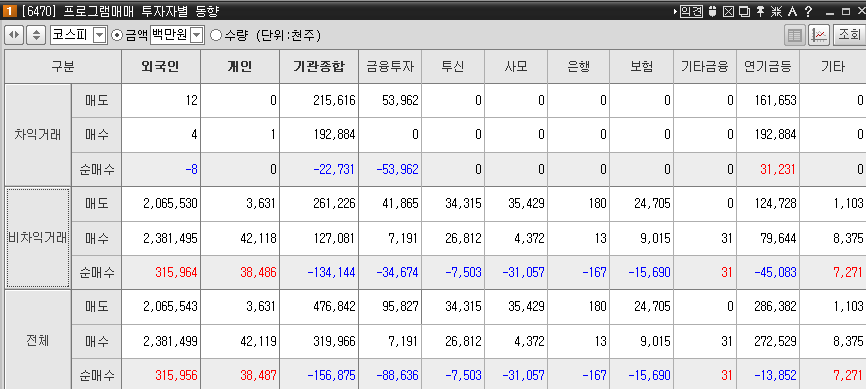 외국인의 영향이 많은 장에서는 프로그램 매매 동향을 살펴서, 현물 주식 흐름을 파악할 수 있습니다.