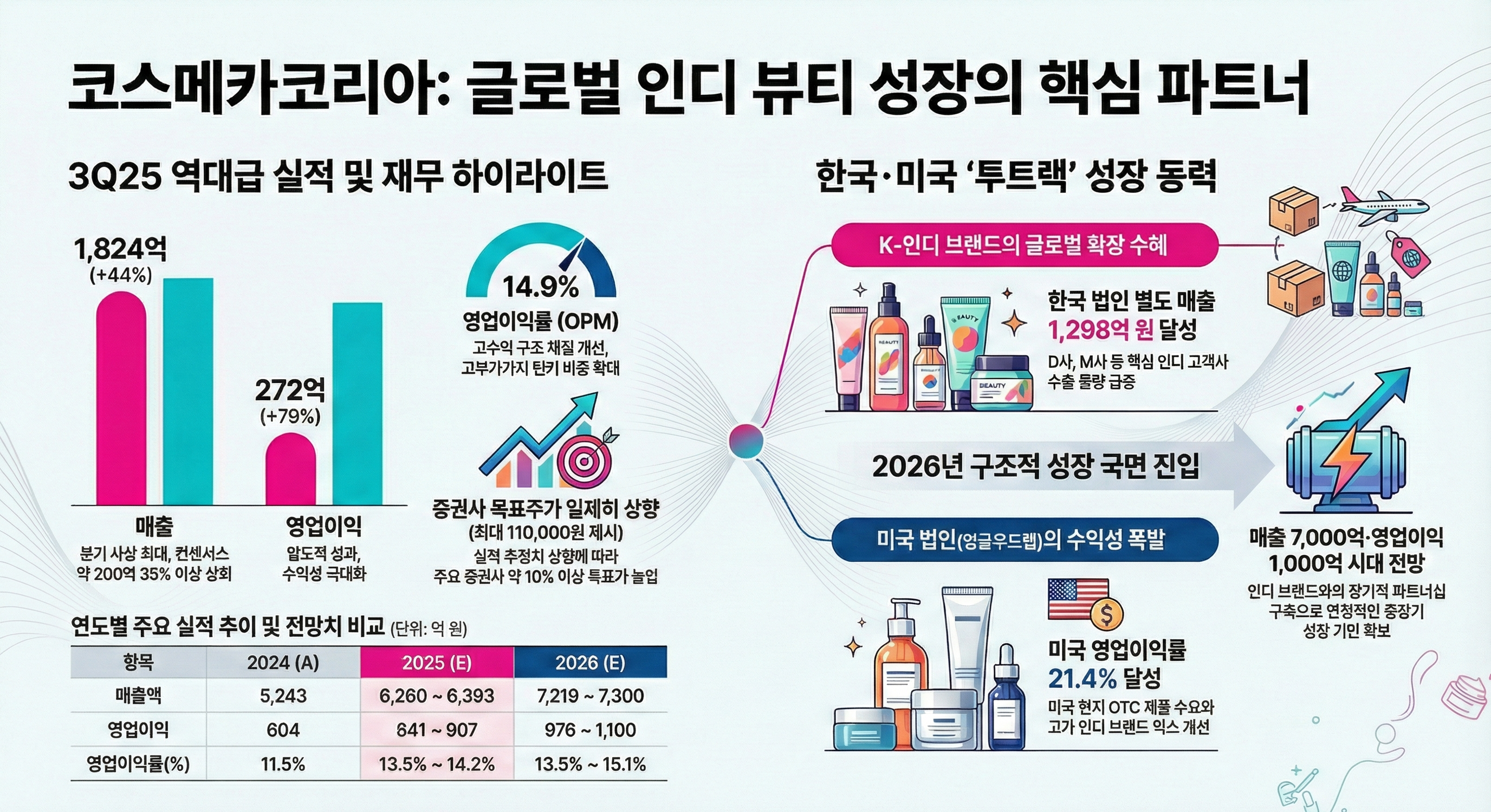 코스메카코리아: 한국·미국 투트랙 성장에 따른 구조적 밸류 리레이팅 분석 보고서1. 투자 하이라이트: 구조적 성장 국면으로의 진입코스메카코리아가 단순한 위탁 생산(ODM)의 영역을 넘어 글로벌 인디 브랜드의 성장을 설계하는 '전략적 플랫폼'으로 진화하며 구조적 리레이팅(Value Re-rating) 국면을 관통하고 있습니다. 과거 대형 브랜드 중심의 경직된 시장 구조가 파괴되고, 신속한 트렌드 대응이 생명인 인디 브랜드 시대로 재편됨에 따라 동사의 제형 창출 능력과 유연한 생산 거점은 대체 불가능한 핵심 자산으로 부상했습니다.본 분석가는 3분기 어닝 서프라이즈의 본질을 '한국 법인의 견고한 펀더멘털'과 '미국 법인의 폭발적 수익성'이라는 양대 엔진의 동기화로 규정합니다. 이는 단순한 일시적 업황 수혜가 ..