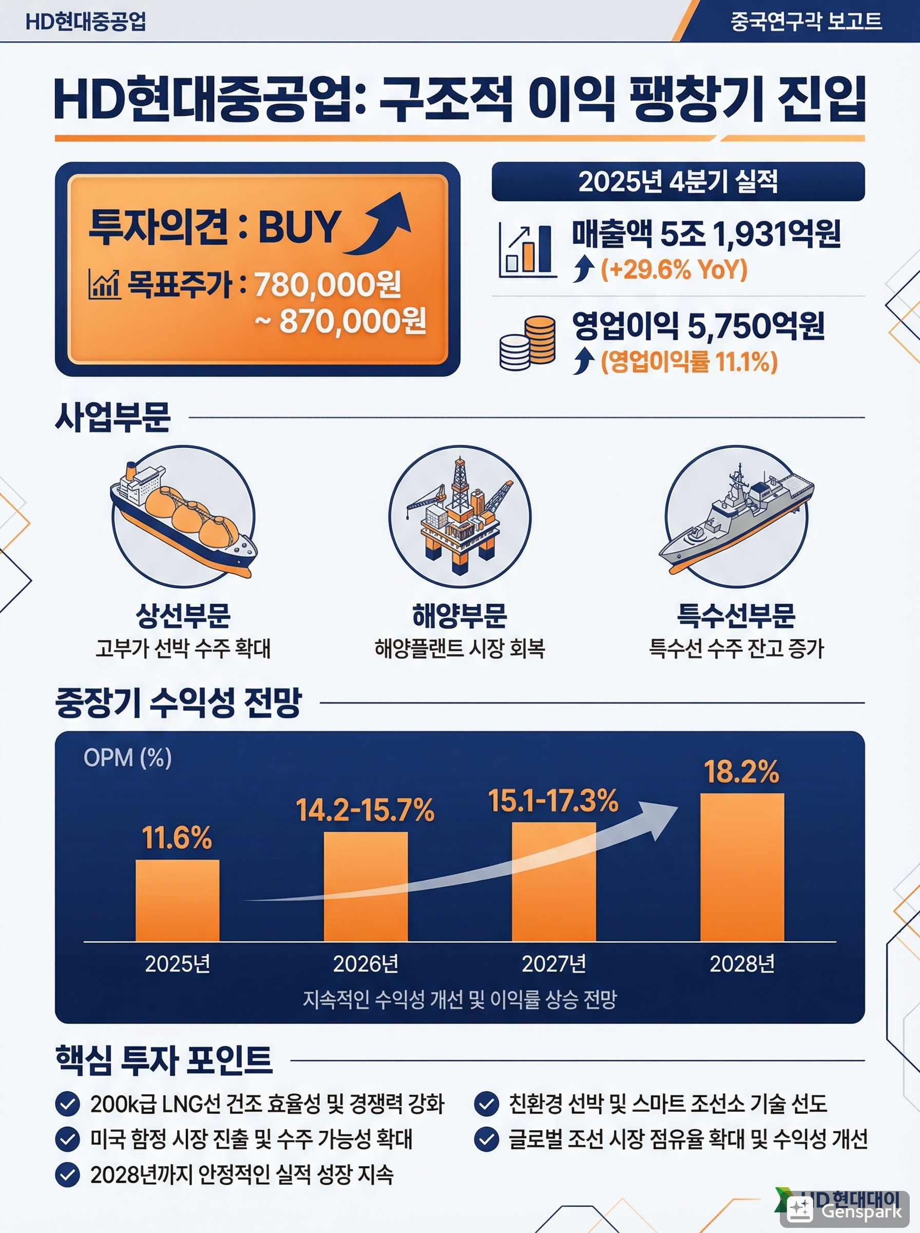 HD현대중공업: 일시적 비용을 압도하는 구조적 이익 팽창기 진입날짜: 2026. 02. 10 투자의견: BUY (유지) 목표주가: 780,000원 ~ 870,000원 종목코드: 3291801. 2025년 4분기 실적 복기: 컨센서스 하회의 본질과 일회성 요인 규명HD현대중공업의 2025년 4분기 실적은 표면적인 '어닝 미스'를 넘어선 질적인 이익 체력의 증명으로 요약됩니다. 영업이익이 컨센서스를 -21.9% 하회했음에도 불구하고, 동사가 기록한 11.1%의 영업이익률(OPM)은 동종사 평균(8%대)을 압도하는 수준입니다.실적 요약 및 변동 분석매출액: 5조 1,931억 원 (YoY +29.6%, QoQ +17.5%)영업이익: 5,750억 원 (YoY +103.8%, OPM 11.1%)비용 구조 분해: 이..