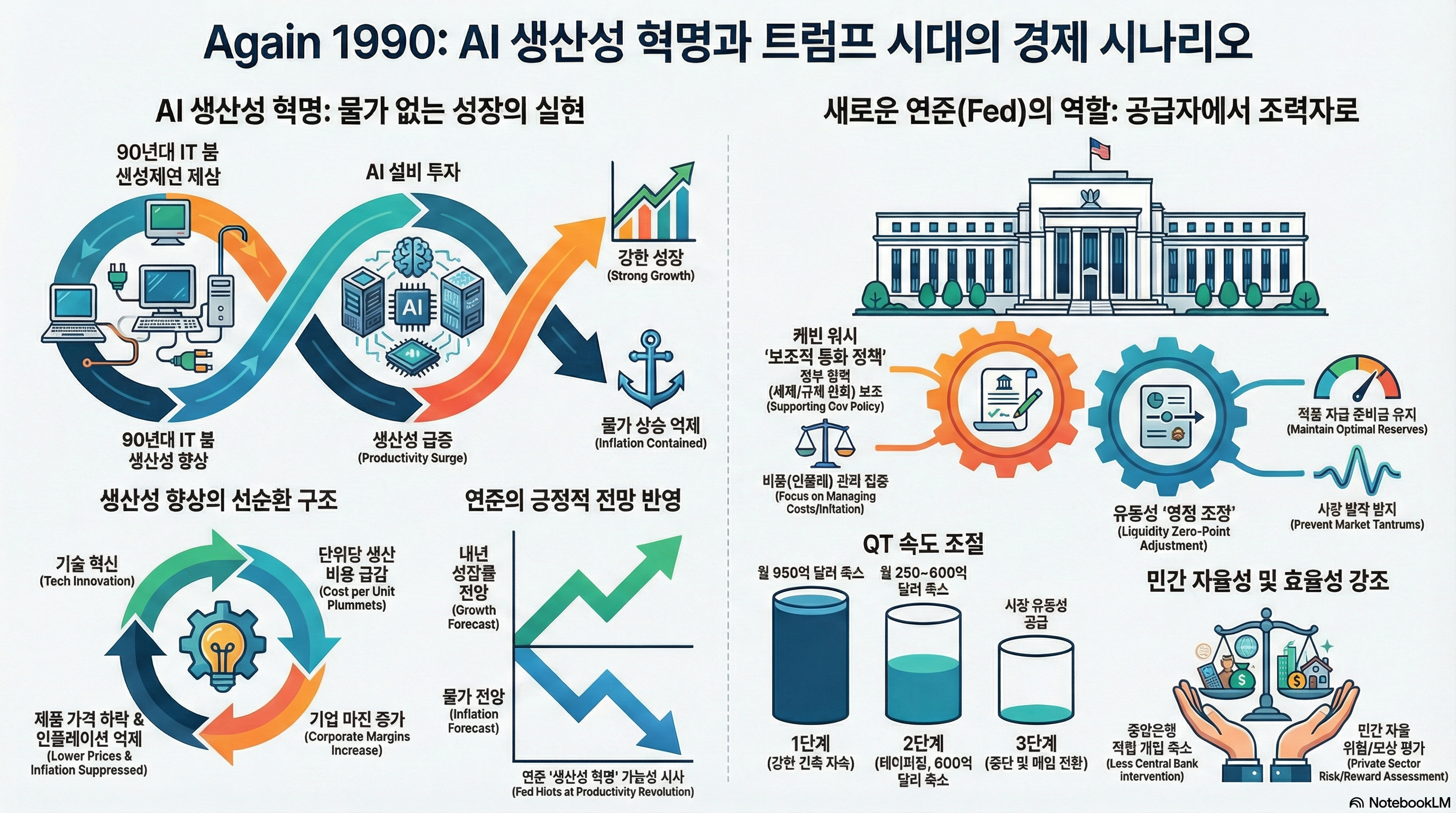 AI와 공급 사이드 혁명: 1990년대 ‘신경제’의 재해석과 거시경제적 함의서론이 조금은 어려운 내용 같지만, 트럼프 정부의 경제 정책으로 AI기술로 생산물품 가격 하락을 통한 인플레이션 억지와 생산성 향상과 FED의 역할 축소로 민간 자율성과 효율성을 제고 하는 것입니다.1. 서론: 공급 사이드 혁명과 자본 심화(Capital Deepening)의 변곡점현대 글로벌 경제는 고물가와 저성장이라는 구조적 정체기에 직면해 있습니다. 이러한 국면에서 인공지능(AI) 기술에 대한 하이퍼스케일러들의 막대한 설비 투자는 단순한 기술 진보를 넘어, 거시경제학적 '자본 심화(Capital Deepening)'를 통한 잠재성장률의 구조적 상향을 시사합니다.1990년대 정보기술(IT) 혁명이 촉발한 공급 사이드 혁명은 생..